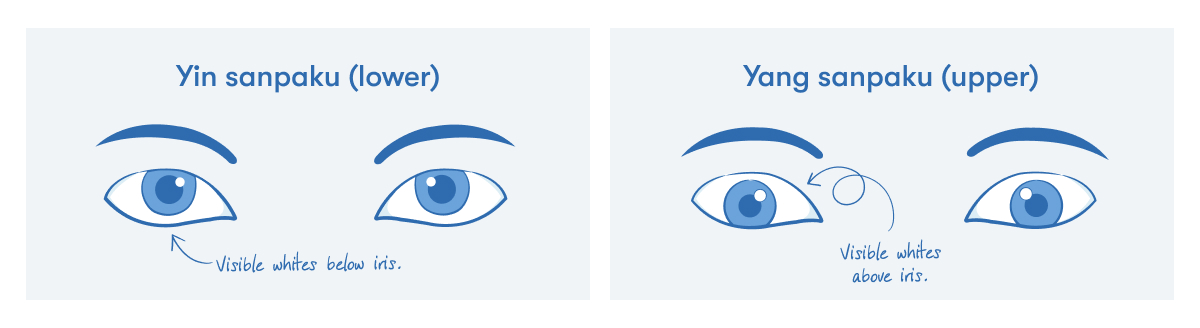 Diagram comparing the two types of Sanpaku eyes This condition is far rarer than the lower form and is often associated with more alarming behavioral predictions. Yang Sanpaku is present when the white sclera is visible abovethe iris.