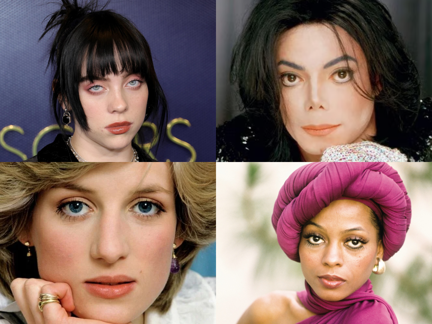 Collage of four celebrities, featuring: Billie Eilish, Michael Jackson, Princess Diana, and Diana Ross. The concept of sanpaku eyes gained significant traction in Western culture after it was linked to several famous and often tragic public figures. While the belief is rooted in superstition, the association with these compelling individuals ensures the topic remains relevant.
