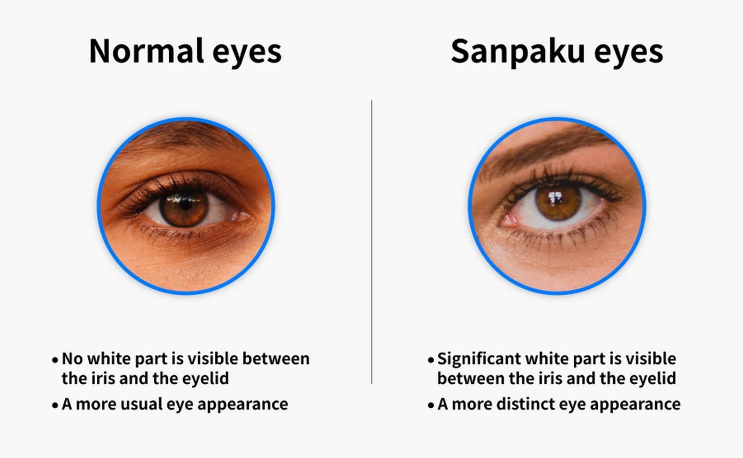 Comparison graphic contrasting a Normal eye with a Sanpaku eye The term sanpaku eyes comes from the Japanese phrase sanpaku gan(三白眼), meaning "three whites." It refers to an ocular feature where the white of the eye (sclera) is visible beneath the iris, above the iris, or sometimes both. Normally, the whites of the eyes are only visible on the left and right sides of the iris.
